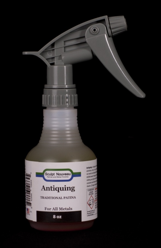 Antiquing Patina creates an aged brown to black finish on bronze, brass, and copper. On iron, steel, aluminum, and zinc, it will produce a grey to black patina. It should not be used on stainless steel. Antiquing Patina does not need to be diluted, but may be thinned with distilled water for a lighter finish. This cold patina is commonly used on the Metal Coatings and as a base for Traditional Green Patinas.