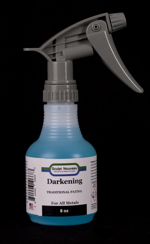 Darkening Patina is most commonly used cold on bronze, brass, and copper to produce a beautiful brown finish. This patina is often diluted with distilled water before use to lighten the color. Normal colors will range from golden brown to very dark brown (almost black). On iron and steel, Darkening Patina will create a grey to black finish. On zinc, this patina will also be black.