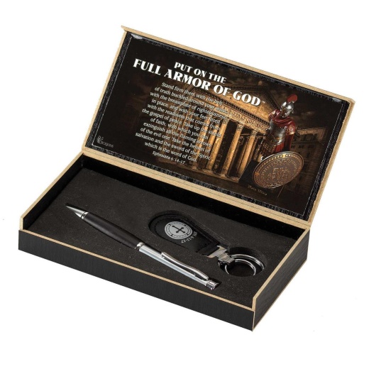 Nestled within the box, a sleek silver metal pen with a rounded black grip awaits, bearing the motivational phrase "Put on the full armor of God" etched on the side of the barrel. The pen writes smoothly with black ink, making it a thoughtful and functional addition to any desk or Workspace. Furthermore, a sophisticated double keyring with a rich leatherette fob is included, featuring a subtle light gray cross design and the Bible passage reference, adding a touch of elegance and spirituality to any set of keys.