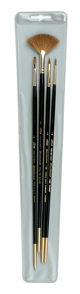 The set includes four essential brushes: Renaissance Round, Size 4; Renaissance Bright, Size 4; Renaissance Fan, Size 4; and Renaissance Cat's Tongue, Size 4. Each one is carefully balanced and fitted with a gloss black hardwood handle, precision-engineered to provide the perfect blend of comfort and control. Whether you're working on delicate details or sweeping vistas, these brushes will respond to your every gesture with precision and flair.