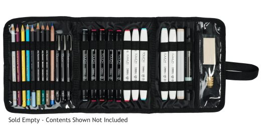 The Rex Art Universal Multi-Media Case features 24 elastic bands in total, comprising 12 larger slots specifically designed to accommodate most markers, and 12 smaller slots perfect for pens, pencils, or smaller barreled markers. This thoughtful design ensures that your supplies are safely stored and easily accessible, making it ideal for transporting your art supplies to class, studio, or client meetings.