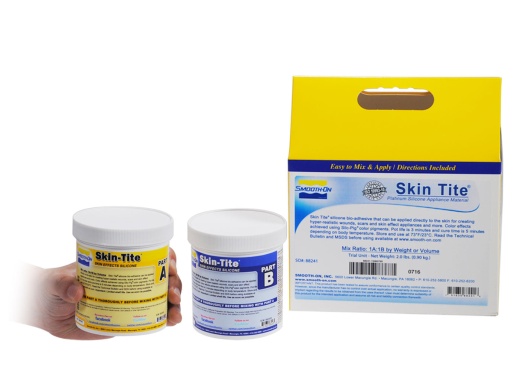 Here’s How To Do It: You can cast Skin Tite™ into either a platinum silicone mold or a rigid plaster mold. Apply a soap solution (1 part dish soap to 2 parts isopropyl alcohol works well) as a mold release and let dry at least 30 minutes. Mix Skin Tite™ 1A:1B by weight or volume and cast into the mold. After the casting is fully cured, the mold release should be washed off with warm water and allowed to dry. Skin Tite™ can be used to temporarily adhere the piece to the skin. Theatrical makeup can be used to further blend and color the piece. After use, remove the piece slowly. Using baby oil or makeup remover can assist in removal.
