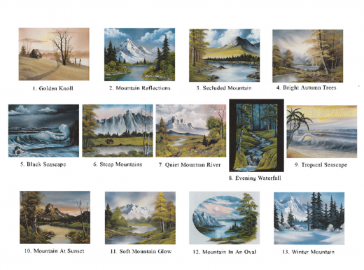 Throughout the series, Bob Ross shares his love of nature and the beauty of the world around us, inspiring you to explore new techniques, experiment with colors, and create your own unique masterpieces. With projects like "Quiet Mountain River", "Evening Waterfall", and "Winter Mountain", you'll be transported to serene and peaceful landscapes that evoke feelings of calmness and tranquility.