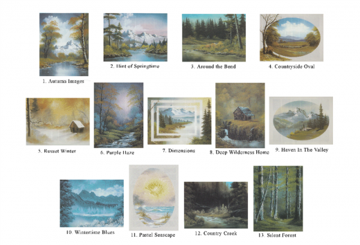In this comprehensive collection, you'll discover an array of captivating projects, including Autumn Images, Hint of Springtime, Around the Bend, Countryside Oval, Russet Winter, Purple Haze, Dimensions, Deep Wilderness Home, Haven In The Valley, Wintertime Blues, Pastel Seascape, Country Creek, and Silent Forest. Each episode is carefully crafted to walk you through the entire painting process, from preparing the canvas to adding the final brushstrokes.
