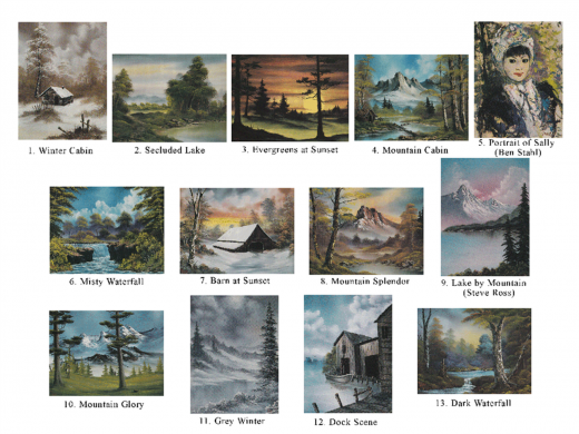 In this exceptional collection, Bob Ross takes you on a journey through breathtaking landscapes, majestic mountains, and peaceful lakes. From the cozy Winter Cabin to the serene Secluded Lake, every project is a masterpiece waiting to be created. Follow along as Bob paints the Evergreens at Sunset, a Mountain Cabin, and a stunning Portrait of Sally, each stroke of the brush a testament to his signature "wet-on-wet" technique.