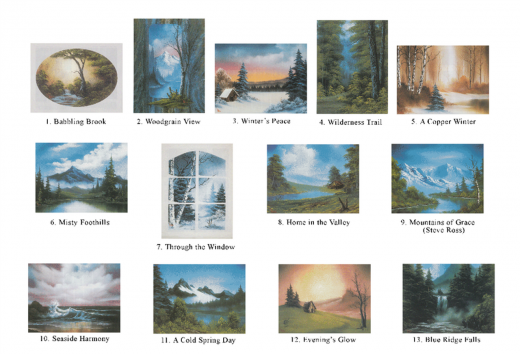 The collection includes an impressive range of projects, each showcasing Bob Ross's signature "happy little trees" and clouds. In "Woodgrain View", you'll learn the art of creating realistic wood textures, while "Winter's Peace" will teach you how to evoke the stillness of a snow-covered forest. Whether you're a seasoned artist or a curious beginner, the Joy of Painting TV30 series has something for everyone.
