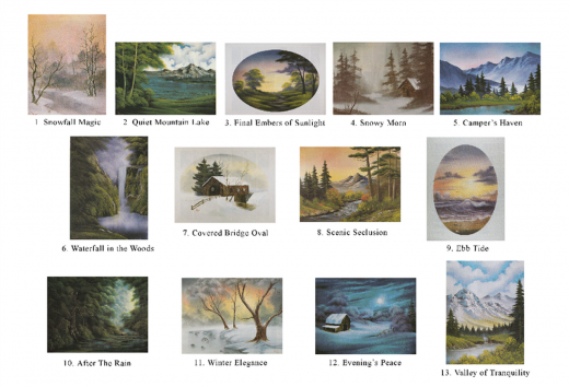 Imagine yourself surrounded by the peaceful landscapes and serene vistas that Bob Ross brings to life with his magical brushstrokes. From the soft, feathery textures of "Snowfall Magic" to the majestic, towering trees of "Quiet Mountain Lake," each project is a masterclass in the art of painting. With "Final Embers of Sunlight," "Snowy Morn," and "Camper's Haven," you'll learn to capture the essence of nature's beauty, and in "Waterfall in the Woods," you'll discover the tranquility of a hidden oasis.