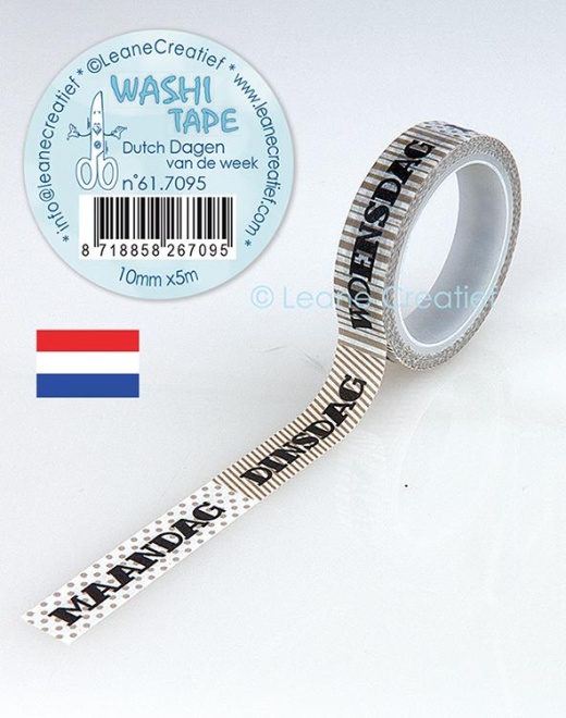 This premium washi tape is designed to inspire creativity and add a touch of elegance to any project. Its versatility, durability, and striking design make it a valuable addition to any craft room or studio. Whether you're a seasoned crafter or just starting out, Leane Creatief's Washi Tape Dutch Dagen Van De Week, 10Mm X 5M is sure to become your new favorite crafting staple.