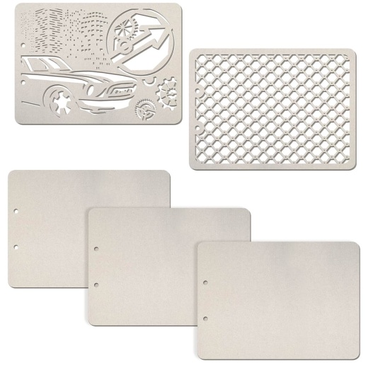 Unleash your creativity with the Ciao Bella Set 5 Album Pages Urban Mood, a unique and versatile collection of chipboard pages designed to help you create stunning albums that reflect your personal style. This set of 5 album pages includes 3 plain rectangular horizontal shaped pages and 2 intricately carved rectangular horizontal shaped pages, each with its own unique design. The carved pages feature two distinctive designs: one with a car and gears, and another with a chain link fence pattern, adding an edgy touch to your album.