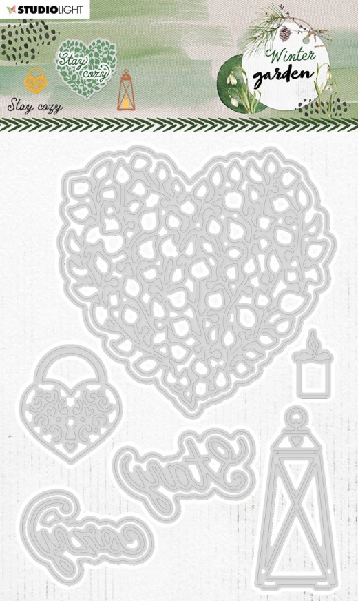 The dies in this set are thoughtfully crafted to provide you with endless creative possibilities. The heart with lush greenery vines adds a touch of whimsy, while the heart-shaped padlock adds an element of romance. The lantern and candle dies will transport you to a winter evening, complete with twinkling lights and warmth. To complete the scene, the included text dies, "Stay" and "Cozy", add a personal touch to your creations.