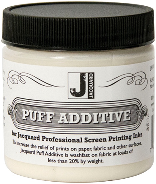 Jacquard Screen Printing Puff Additive 4oz 4oz Used to increase the relief of prints on paper, fabric and other surfaces. The microspheres in the Puff Additive expand with heat, giving you a raised print only after heating. Once puffed, the print is washfast and dry cleanable. Can be used on natural or synthetic fabric, paper, vinyl, metal and leather. This package contains 4oz of puff additive. Conforms to ASTM D 4236. Made in USA.