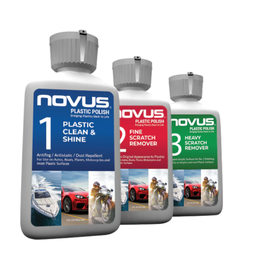 The Novus Plastic Polish Kits are specially designed to clean and remove scratches from all types of plastic, fiberglass, or acrylic surfaces. The kit comes in two sizes: a compact 2oz kit that fits neatly in your glove compartment, saddle bag, or carrying case, and an 8oz kit for larger projects. Each kit includes three essential products: NOVUS 1: Plastic Clean & Shine, NOVUS 2: Plastic Fine Scratch Remover, and NOVUS 3: Plastic Heavy Scratch Remover.