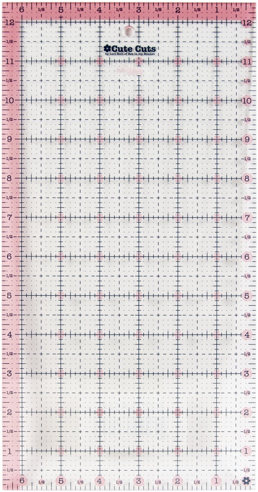 Riley Blake Cute Cuts Ruler 6.5"X12.5" The Cute Cuts Rulers by Lori Holt of Bee in my Bonnet are non-slip and easy to read for extreme accuracy when cutting. The ruler has pink and denim markings printed in 1-inch grids marked in 1/8 and 1/4 increments. This package contains one 6.5X12.5 inch ruler. Imported.