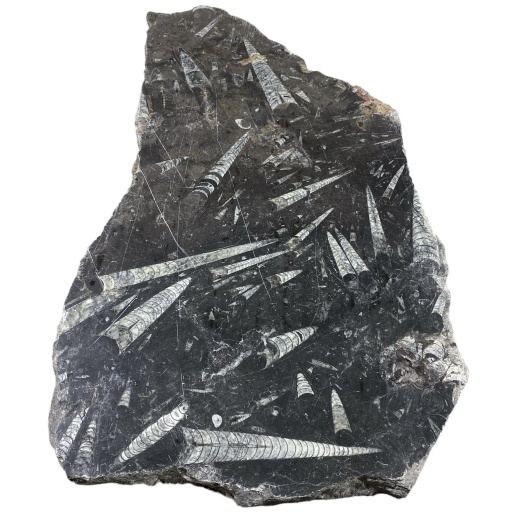 - Unique slab form showcases intricate pattern of Orthoceras fossils