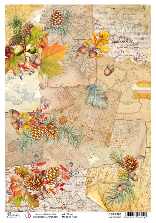 TheInto The Wild collection is a treasure trove of breathtaking landscapes, majestic wildlife, and the quiet beauty of nature. This A4 sheet of rice paper is a collage of Autumn images featuring iconic symbols of the season: Maple leaves, pine branches, pine cones, acorns, and vintage maps and postcards. The result is a mesmerizing fusion of colors, textures, and patterns that will inspire your imagination and ignite your creativity.