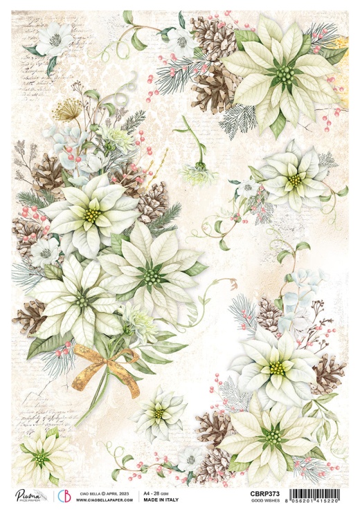The Good Wishes design showcases a beautiful array of floral elements, featuring bouquets of White Poinsettias, intertwined with lush pine branches, pine cones, and berries. This enchanting pattern will transport your creative projects to a winter wonderland, infused with warmth and festive cheer. As an artist, crafter, or paper enthusiast, you'll appreciate the exceptional quality and versatility of this rice paper, which lends itself to a wide range of techniques and applications.