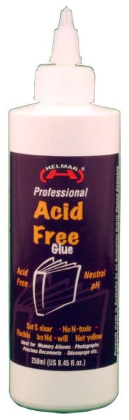Helmar Acid Free glue has been specifically formulated for memory albums, book binding, mounting photographs, preserving old or precious books, documents,