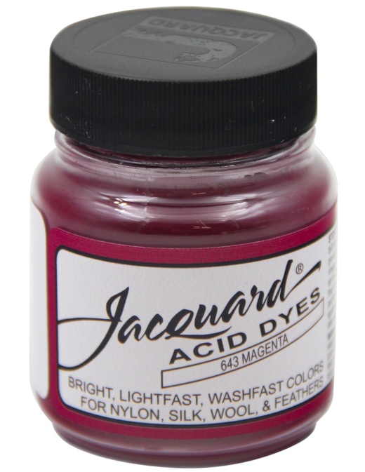 Take your textile art to the next level with Jacquard Acid Dyes .5oz. These concentrated powdered hot water dyes produce the most vibrant possible results on protein fibers including silk, wool, cashmere, alpaca, feathers, and nylon. The only acid involved is the vinegar or citric acid you add, making it a safe and easy process.