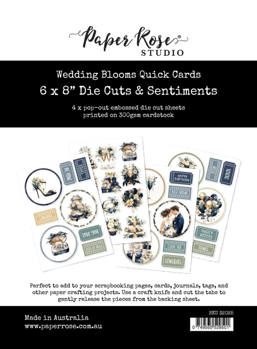 At the heart of this stunning collection lies a meticulously curated set of die-cuts and sentiments that seamlessly complement the Wedding Blooms Quick Cards Kit. Crafted with precision and attention to detail, these extra die-cuts and sentiments are carefully designed to add an extra layer of sophistication and charm to your handmade cards. With four intricately designed die-cut sheets, you'll be spoilt for choice when it comes to selecting the perfect accents for your wedding-inspired masterpieces.