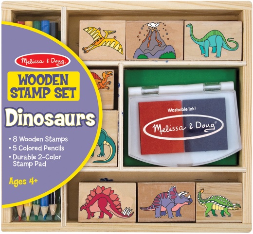 Wooden Stamp Set Dinosaur Featuring a rainbow, hearts and more, this set contains everything you need for cute art projects to share with friends! A tremendous value! This package contains Nine stamps, a two-color inkpad, and five colored pencils are conveniently contained in a sturdy wooden box between projects. Available in a variety of designs. Each sold Separately. Recommended ages four years and up. Imported.
