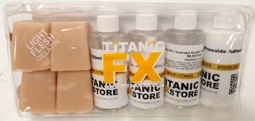 Our Titanic Fx Prosthetic Gelatin Starter Kit includes everything you need to get started with gelatin prosthetics. The kit contains 4 gelatin nuggets in your chosen colour, as well as a 4-piece application/remover kit that makes it easy to apply and remove your prosthetic pieces.