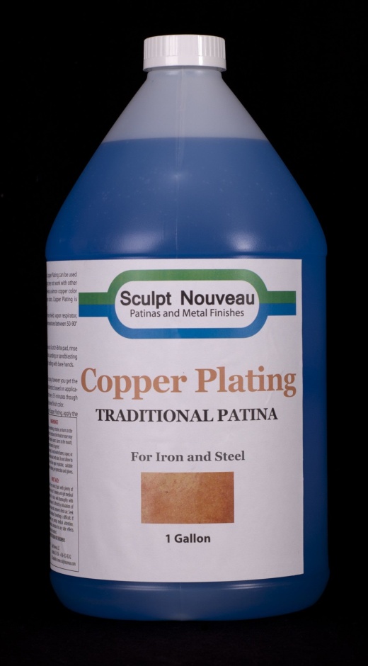 Copper Plating Patina produces a copper finish on iron and steel. Applied cold, lighter coats will develop a salmon copper color while heavier coats will produce darker copper colors. Copper Plating does not work with the Metal Coatings or most other patinas such as Tiffany Green. However, it can be used as a base for the Traditional Torch Patina. Diluting should not be necessary with this formula.