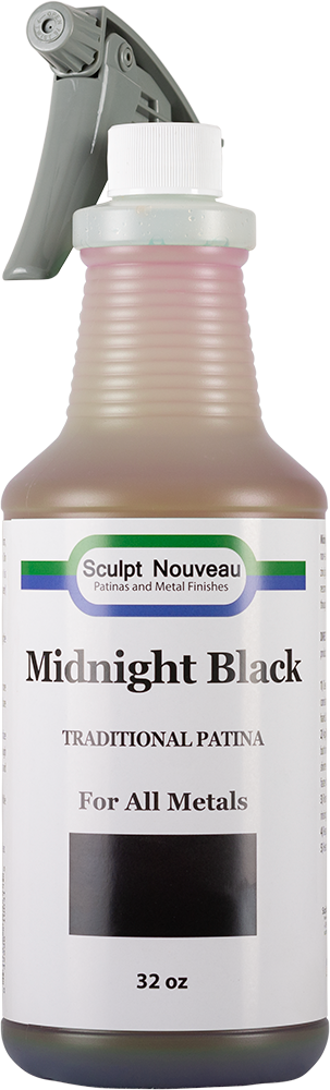 Traditional Midnight Black Patina reacts on aluminum, bronze, brass, copper, iron, steel (not stainless), and zinc/galvanized. This patina is notable for its striking aged black finishes, fast reaction times, and excellent durability. Also, rust is slower to develop compared to other black patinas, which allows for more flexibility when applying a sealer.