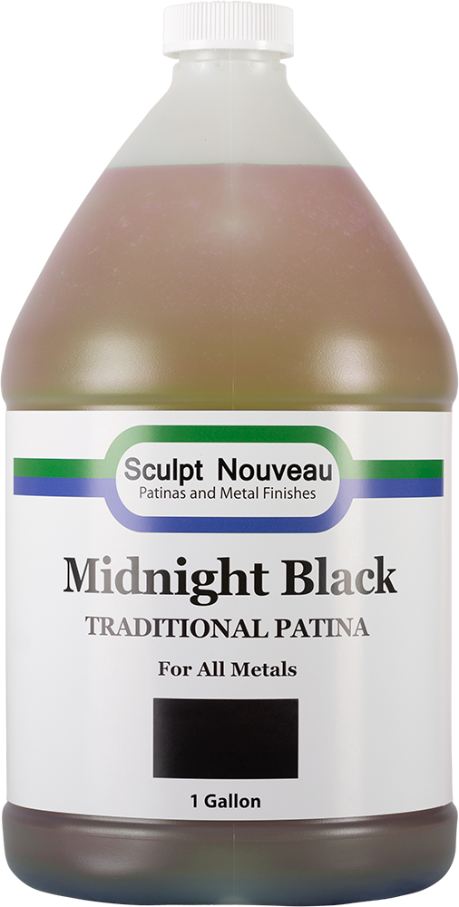 Traditional Midnight Black Patina reacts on aluminum, bronze, brass, copper, iron, steel (not stainless), and zinc/galvanized. This patina is notable for its striking aged black finishes, fast reaction times, and excellent durability. Also, rust is slower to develop compared to other black patinas, which allows for more flexibility when applying a sealer.