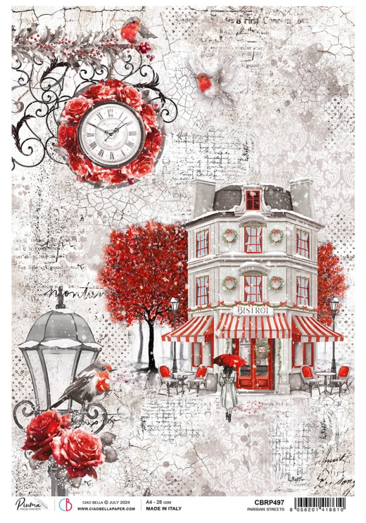 The stunning visuals of the Rice Paper A4 Parisian Streets collection won't just beautify your projects; they’ll also enhance the overall aesthetic appeal of your décor. Featuring a winter scene with a woman carrying a red umbrella, a charming Parisian bistro, and soft roses, these designs evoke warmth and love reminiscent of Paris. Perfect for home decor projects, scrapbooking, or even greeting cards, this collection captures the essence of Parisian elegance like no other, making it a must-have for anyone wanting to add a sophisticated flair to their art.