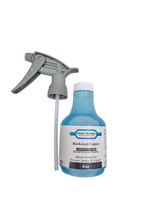 Blackened Copper Patina works on bronze, brass and copper. This is a concentrated patina and requires dilution before use (typically 10-50% with distilled water). Depending on the dilution amount and application method, it will produce a beautiful transparent black finish.