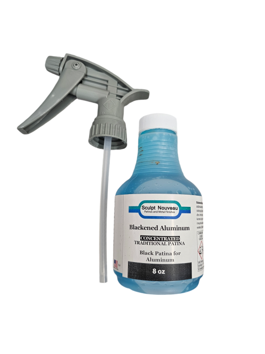 Blackened Aluminum Patina reacts on aluminum and pewter. It is sold concentrated and should be diluted 10-50% with distilled water. Depending on the dilution amount and application method, it will develop a light grey to black patina. Apply at room temperature with a sprayer or in a bath (immersion).