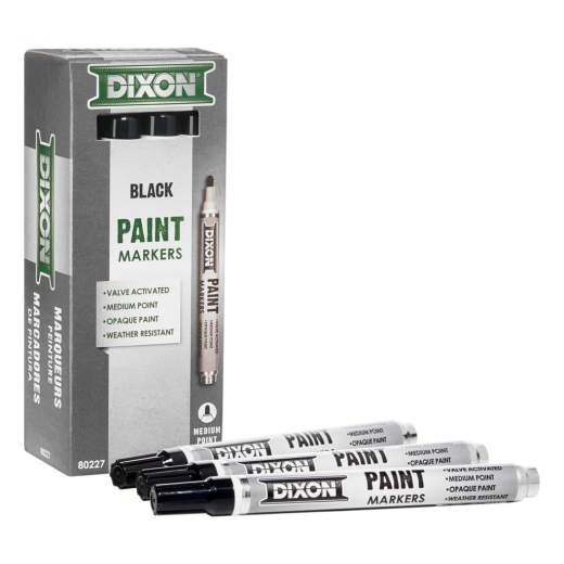 Dixon Paint Markers produce permanent, opaque colors on most surfaces including metal, wood, glass, stone, plastic, leather, vinyl, textiles, ceramics, cement, paper and rubber. These oil-based markers maintain color intensity regardless of the surface to which they are applied. The durable color is lightfast, waterproof and weatherproof. The special valve-action tip prevents dry-out. Dixon Paint Markers feature a sturdy metal barrel and are made in U.S.A. More than a writing and art products company, Dixon Ticonderoga empowers people to take conscious and subliminal thoughts, facts, ideas and dreams, and preserve them using tools that are simply extensions of themselves.