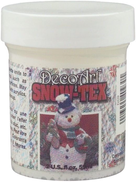 Snow-Tex 2oz DECO ART-Snow Tex. This will give you realistic dimensional effects of snow. Just apply with a brush, sponge or knife and let it dry. This package contains a 4oz jar of snow-tex. Conforms to ASTM D 4236. Made in USA.