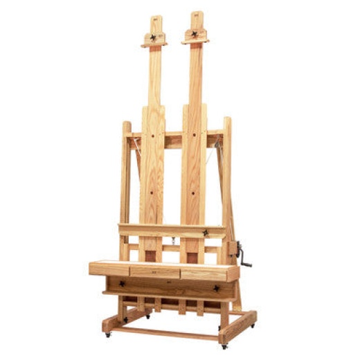 BEST Line's largest easel, the Abiquiu Deluxe is constructed of hand rubbed solid oak. By loosening the knobs on the back of the easel, the artist can adjust his or her painting to any tilt or angle. The hardware was designed and made especially for this easel. Up to 300 pounds can be lifted by the heavy-duty marine winch pulley system. Rubber casters make mobility possible.