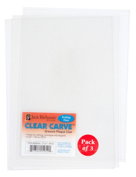 Made of flexible, durable material our Clear Carve Etching Plates are easy to carve and will not dry out or crack over time. Because it is transparent it eliminates the need for transferring images; it’s great for use with photographs, magazines or any printed image.