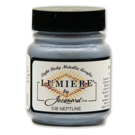 Jacquard Lumiere Metallic Acrylic Paint 2.25oz Neptune JACQUARD-Rupert, Gibbon & Spider Inc: Lumiere. Light body metallic acrylic paint. These paints were designed to cover dark backgrounds with light application. On light backgrounds they produce a subtle designer palette alternative to a more intense color scheme. They brush on smoothly, are waterbased, dry cleanable, light fast, and remain soft & flexible when dry. May be painted, stenciled, screen printed, airbrushed (when diluted), and stamped on fabrics, canvas, wood, paper, and more. They may also be added to NeOpaque to produce an antique effect. Paint conforms to ASTM D4236. This package contains one 2.25oz/70ml jar. Available in a variety of colors: each sold separately. Made in USA.