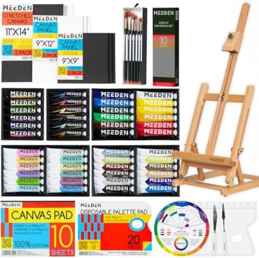 - ALL-IN-ONE ACRYLIC PAINTING SET – 72 PIECES: This MEEDEN Acrylic Paint Set has everything you need to get started! It includes 48 vibrant acrylic colors (22ml tubes), a foldable wooden tabletop easel, 10 paint brushes, 6 canvas panels (b/w), 2 stretched canvases (b/w), 1 color wheel, 2 painting knives, a palette, and an acrylic pad.