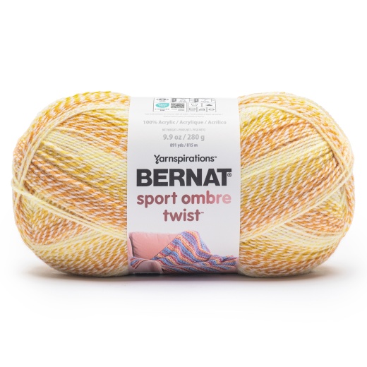 Bernat Sport Ombre Twist Yarn Honeyed Gold A fun, flowing color effect showcased in a 2-ply acrylic yarn. The dk weight is perfect for lightweight crochet blankets and pillows as well as breezy garments that arent too stiff and heavy. Stitches surprisingly quickly and has incredible yardage. Colors flow and shift, which keeps the project interesting as you're stitching. Weight Category: 3. Content: 100% Acrylic. Put up: 3.8oz/280g, 1,004yd/918m. Gauge: 22sx30r=4in/10cm on size US6/4mm knitting needles. Suggested crochet hook size: USG6/4mm. Dyelotted: we try but are not always able to match dyelots. Machine Wash Cold, Delicate/Gentle Cycle, Do Not Bleach, Tumble Dry Low Heat, Delicate/Gentle Cycle, Do Not Iron, Do Not Dry Clean. Imported.