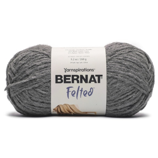 Bernat Felted Yarn Metal Bernat Felted is a textured yarn made from a blend of Acrylic, Wool and Nylon with brushed plies that create air and space within the yarn, making it light and warm. You can easily stitch your next big project using Felted and with a combination of visible stitch definition and thick gauge you will look like a pro! Weight Category: 6. Content: 62% Acrylic, 21% Wool, 17% Nylon. Put up: 9.2oz/260g, 249yds. Gauge: 11st x 15r = 4in/10cm on size US11/8mm knitting needles. Suggested crochet hook size: US11/8mm. Dyelotted: we try but are not always able to match dyelots. Available in a variety of colors. Each sold separately. Machine Wash Cold, Permanent Press, Do Not Bleach, Tumble Dry Low Heat, Delicate/Gentle Cycle, Do Not Iron, Do Not Dry Clean. Imported.