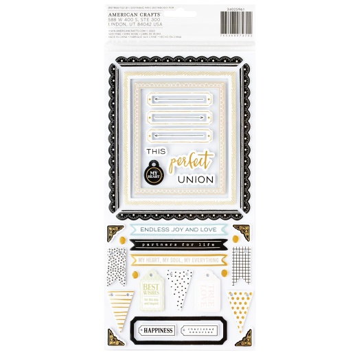 American Crafts A Perfect Match Thickers Stickers 91/Pkg Phrase, Gold Foil A Perfect Match by American Crafts is a collection for love and celebrations, where graceful moments of joy will be recorded creating unforgettable memories that will be remembered for years to come! Black, white, and neutral color palette with subtle pops of soft colors fill this collection with perfect color scheme. The sophistication and refined char to capture the unforgettable and timeless beauty of any wedding or anniversary. Add an adorable phrase to your projects! These phrase Thickers are great for scrapbook pages, cards, mixed media projects, journals, planners and so much more. This package includes 91 phrases and accents.