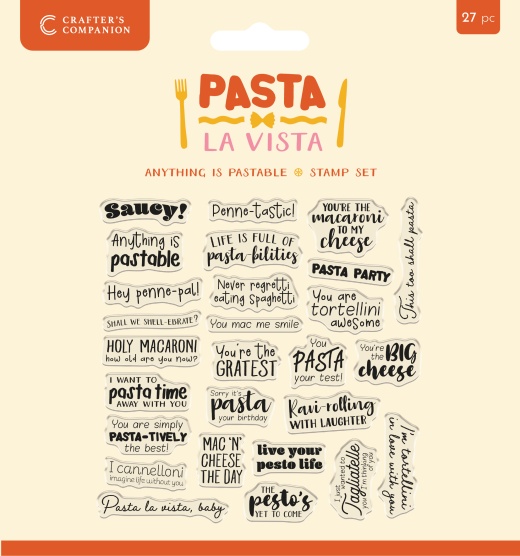 Give your crafts and projects the reminder that Anything is Pastable with this Photopolymer Stamp set from the Crafter’s Companion Pasta La Vista Collection. This set includes 27 stamps of pasta-themed positive sentiments, ideal for handmade greeting cards, giftboxes, and more for your carb-obsessed friends.