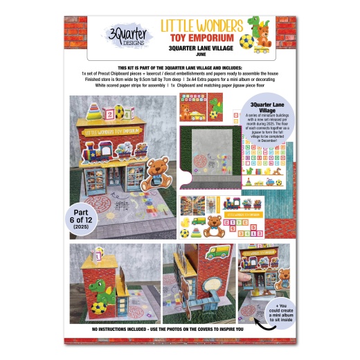 Part 6 of the Lane Village collection, the Little Wonders Toy Emporium set is a fun collection of old fashioned games, a slide, hopscotch and more. Blues, reds and yellows add a fun feel to this English style toy shop. The set comes with spare papers to make a mini album inside if you wish! Or create something else with the extra papers. The covers have photos to show you what to do but no instructions are included. A video will be available on the 3Quarter Facebook page as well as the album for the 3Quarter Lane village examples.