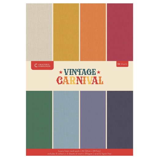 The A4 Luxury Linen Cardstock from the Vintage Carnival by Crafter’s Companion includes eight different colours