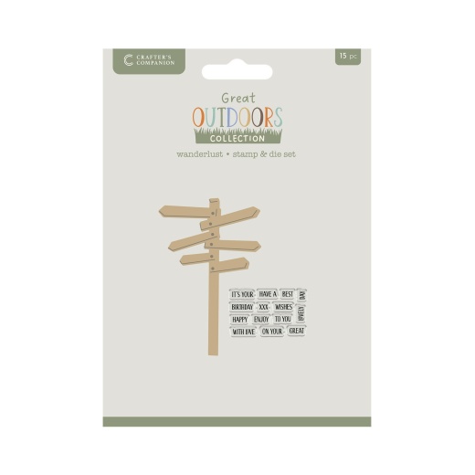 Embrace your adventurous side in your crafts and projects with the Wanderlust Stamp & Die Set from The Great Outdoors collection by Crafter’s Companion. Create a signpost with encouraging positive sentiments perfect for all your handmade cards, scrapbook pages, and more.