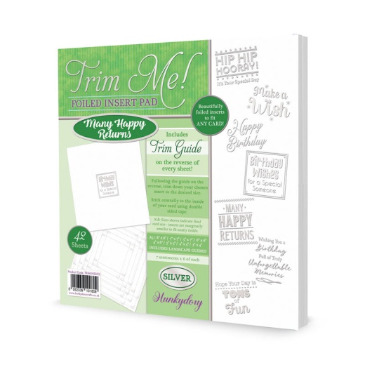 The Many Happy Returns Trim Me! Foiled Insert Pad contains 42 pages featuring 7 super special birthday themed insert designs. Each sentiment is foiled in signature stunning silver foil, which ensures you can add a real touch of stand-out luxury and style within your cards. Rather than your everyday sentiments, inside the pad you will find super elegant typography that make up heartfelt words including; Happy Birthday, Many Happy Returns, Hip Hip Hooray!, It’s Your Special Day, Wishing You a Birthday Full of Truly Unforgettable Memories, Birthday Wishes to a Special Someone, Make a Wish and Hope Your Day is Tons of Fun! We have you covered for any recipient, all year round, with this versatile selection of sentiments.