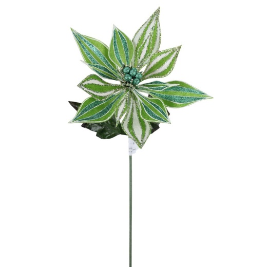 24" GREEN WHITE GLITTER STRIPE POINSETTIA STEM - 226178