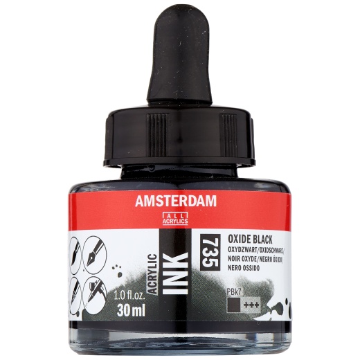 Amsterdam Acrylic Ink 30ml Oxide Black This highly fluid acrylic ink has very low sedimentation, can be thinned with water or mediums, and dries waterproof. Spectacular performance with airbrush, technical pen, fountain pen, brush application, poured or utilize the dropper that comes with the jar. Ideal for a wide range of techniques like calligraphy, watercolor and airbrush. This package contains 1oz of acrylic ink. Comes in a variety of colors. Each sold separately. Imported.