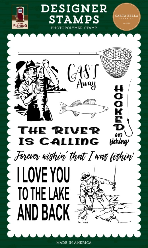 Carta Bella Stamps Hooked On Fishing, Gone Fishing Our NEW Gone Fishing collection is a reel catch!Our 4 x 6 clear acrylic stamps are designed to be used with your favorite stamping blocks and a variety of markers and inks to accent all types of projects!Stamp Set includes 9 Stamps.