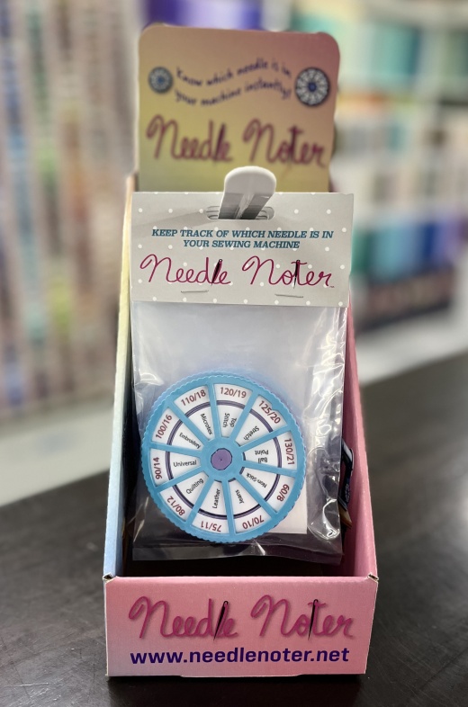 Needle Noter Sewing Machine Needle Tracker Purple/Teal The Needle Noter keeps track of which needle is in your sewing machine. It can be attached to your sewing machine with hook & loop tape to easily remove and change the needle information. The Needle Noter has three moveable discs. The bottom disc will tell you the application type of needle, the middle disc is the size of the needle, and the top disc indicates with an arrow which needle you put in the machine. Select your needle type by aligning the bottom two discs by type and size and spin the top arrow to note it. Then attach to your machine. Change the setting each time you change the needle. Made in the USA.