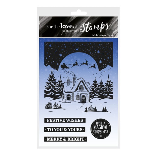 The A Christmas Night stamp set includes a large centrepiece scene of a cosy cottage nestled between large, snowy trees. Santa and his reindeers fly across a night sky, in front of a large moon and mountain range. Complete the scene with a choice of three rectangular sentiments that read 'Festive Wishes', 'To you & yours' and 'Merry & Bright'. The set also includes a beautiful sentiment badge that reads ‘Have a magical Christmas’ and is decorated with dot details and a snowflake.